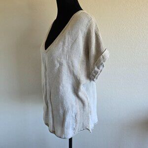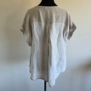 Cotton linen blend woven top from Meo Meli - Italy - semi sheer - contrast fabrics to back yoke sides and sleeves - curved hem - short/cap sleeve with cuff of contrast fabric - pleat center back - curved hem
