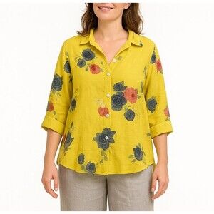 Meo Meli Made in Italy Yellow Floral Linen Blouse Fits Like M Button Front 3/4 Sleeve