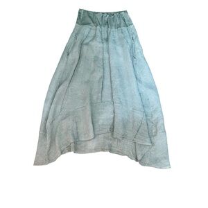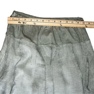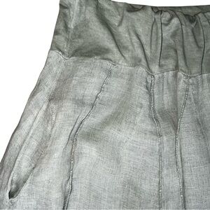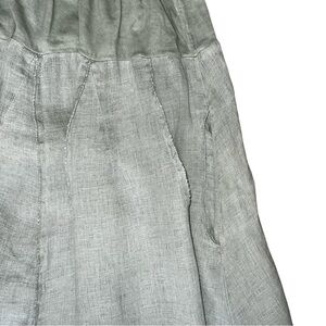 Meo Meli bohemian linen/cotton skirt made in Italy pockets light and airy exposed seams elastic waistband worn lower on hips for a carefree aesthetics sage green no size tag I believe it could fit several different sizes. See photos for measurements