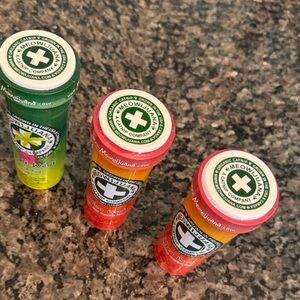 Set of three Meowijuana catnip blends in green, orange, and red containers. Perfect for cat playtime.