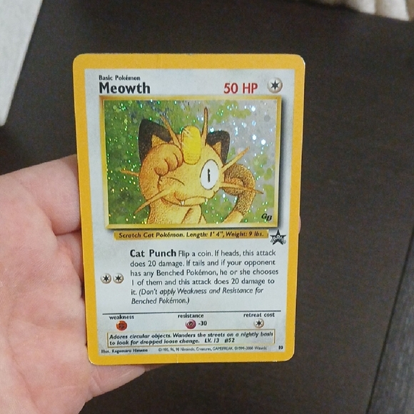 Black Star Promo Meowth, card is in heavily played condition. Holographic and rare, card is set in a hard plastic sleeve.