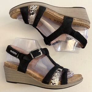 Mephisto Size 37 (US 7) Cork Sandals, Women’s Wedges Shoes, Black Leather With Snakeskin Print, Adjustable Straps. Preowned. Gently worn.