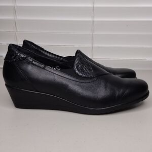 Mephisto Air-Jet women's black leather comfort slip on wedges size 9.