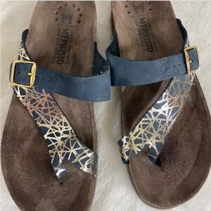 Experience the perfect blend of style and comfort with Mephisto's blue and gold sandals. These sandals feature a unique design with a striking combination of solid blue and gold accents, complemented by a decorative buckle. Ideal for casual summer outings, they offer a chic and versatile addition to your footwear collection.