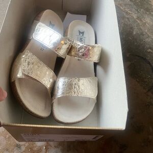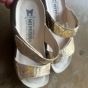 Elegant Mephisto sandals with gold and silver textured straps. Ideal for everyday wear.