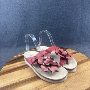 Stylish red sandals with floral accents. Comfortable footbed. Adjustable strap.