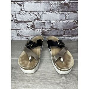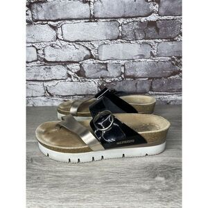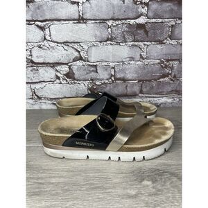 Selling Mephisto Silver Leather Black Patent Toe Strap Cork Wedge Sandals Women Sz 38EU/7.5M US