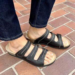 These black leather Mephisto Three Strap Slide Sandals are as chic as they are comfy!