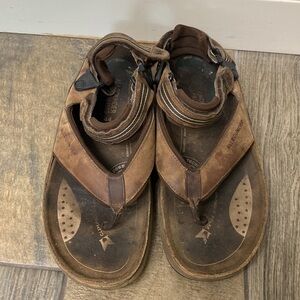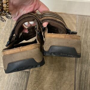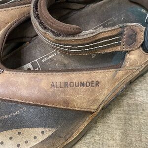 Mephisto allrounder brown leather sandals size 10. Good used condition.Velcro closure.leather around Velcro is not in good shape and is flaking off as shown in pic.Otherwise good condition.