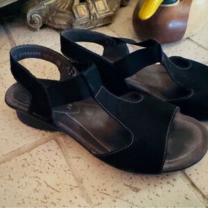MephistoāPetrea low heel t-strap sandals in black suede and VGUC size 8