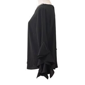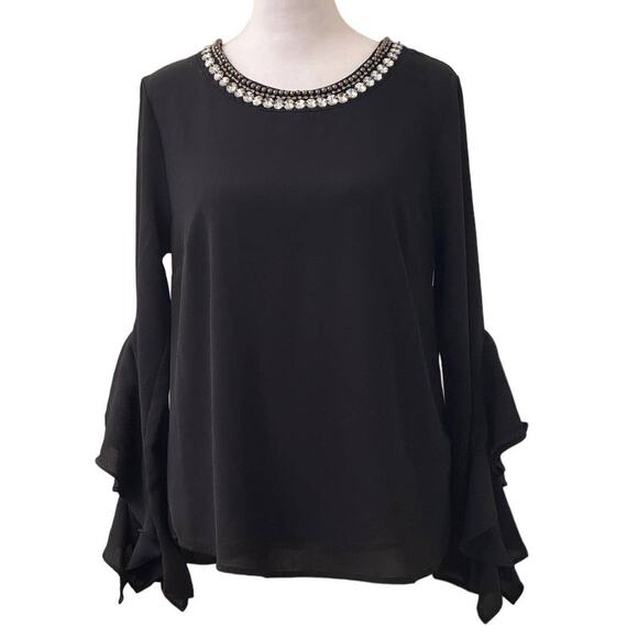 Meraki Black Long Sleeve Flutter Blouse Top Rhinestone Neckline Size M