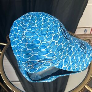 One size. New with tag. Tag has been cut. As a "NO DIVING" special edition for 2023, the baseball cap combines best wear comfort with sporty design. The George Russell baseball cap is designed as a 6-panel baseball cap and, in addition to the Mercedes star, also features the Mercedes-AMG F1 Team logo, George Russell's number 63 and various other partner logos. Designed in blue.