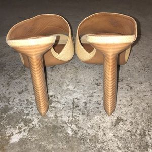 NWOT Mercedes Castillo "Paulina" Mule Sandals in Natural (Beige); An asymmetrical raffia band boasts a chic and summery woven texture on a mule lifted by a slim stacked heel.