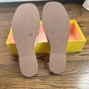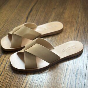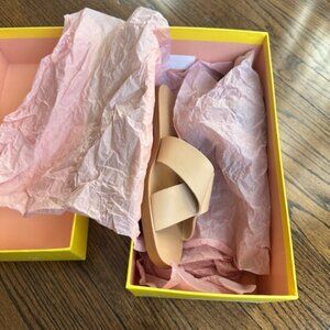 Pretty and easy to wear leather slides. Wear with jeans, shorts, skirts...Color is neutral wear with anything - somewhere between the colors cream, tan, khaki...