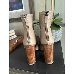 A dramatic teardrop heel crafted from stacked slivers of wool elevates a sleek, stretch-nappa leather bootie in a beautiful--and extremely versatile--sandy hue.