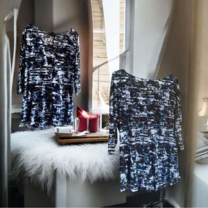 Embrace casual elegance with this Mercer & Madison blouse, featuring a striking black, blue & white pattern. The 3/4 sleeves and scoop neckline offer a comfortable fit, making it perfect for everyday wear. Its modern design and soft fabric ensure both style and comfort.