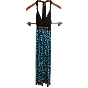 Mercer & Madison Brown and Blue Jeweled Vneck Halter Maxi Dress
