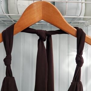 Excellent condition, size 4, Mercer and Madison chocolate brown and blue patterned halter neck dress with adjustable straps, padded cups, and jeweled empire waist