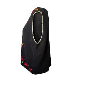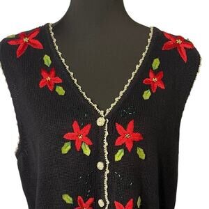 Mercer Street Studio Women's L Embroidered Beaded Sequin Silver Metallic Thread Outline, Holly Applique, Embroidered Poinsettia with Metallic Silver Button Front Christmas Sweater Vest.