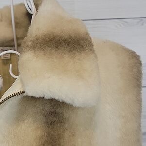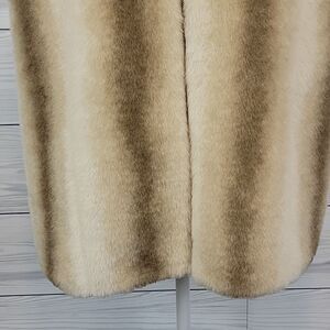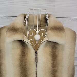 Honey colored faux mink fur vest by Mercer Street Studios with a ribbed knit sweater back, a full zip front, and a straight hemline. Beautiful and in great pre-owned condition.