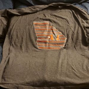 T-shirt is 50% cotton/50% polyester and charcoal gray. Design includes the Mercer University logo superimposed on a picture of the state of Georgia with a star noting Mercer's location in Macon. Brand is Champion.
