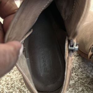 Tan/light brown stacked 3” heel boots with studded detail and inner zip ankle.