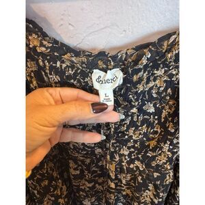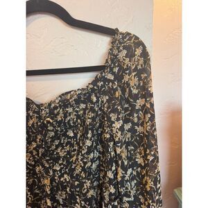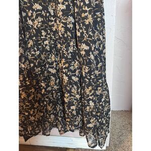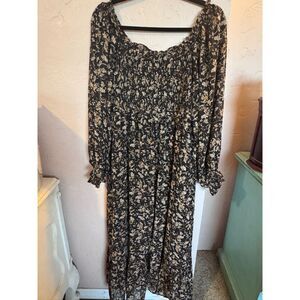 &Merci black floral maxi dress. Fully smocked bodice which is very forgiving. Sleeves are semi sheer and can be worn on or off shoulder with ruffle trim detailing. Elasticized wrists with accent ruffle. Size large. Excellent condition.