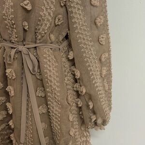 Features semi-sheer long balloon sleeves, inner lining, and a wrap tie belt.