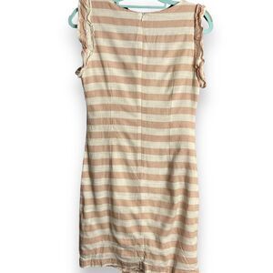 Cute women's striped faux wrap dress. This dress is sleeveless with ruffle detailing on the sleeves. There is no stretch or pockets and the dress is lined. Good overall condition. No rips or stains. Minimal signs of wear and wrinkling