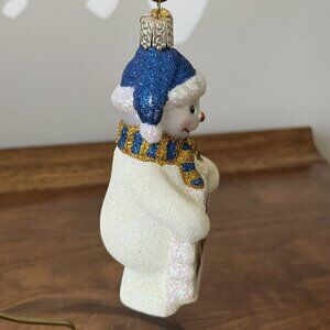This ornament is in very good pre-owned condition. There is minor glitter loss on the side of the snowman's hat in one tiny area and on the bottom of the back (see last two photos).