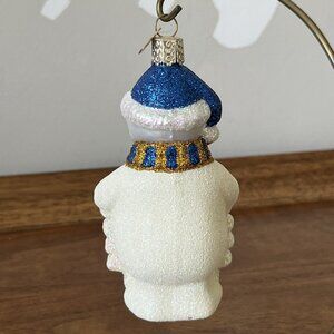 Fun, hard-to-find Merck Family's Old World Christmas (OWC) blown glass University of Michigan (U-M Wolverines) snowman ornament featuring the university's blue and yellow colors and "M" logo. This ornament was made in the late 2000s or early 2010s and is retired and hard to find. The snowperson wears a scarf and hat. The ornament is embellished with glitter.