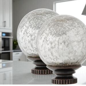 A decorative set of curtain rod finials featuring mercury glass spheres mounted on oil-rubbed bronze bases. Designed to fit 1-inch diameter rods, these finials add a refined industrial touch to any room.