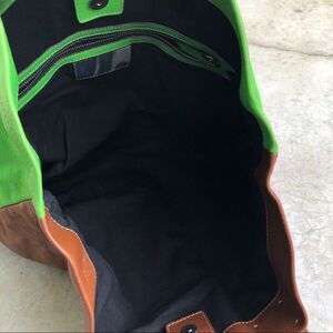 Lime green and rich brown leather reversible colorblocked handbag. Silver tone hardware. There is a ring of faint discoloration on the green side. Otherwise excellent condition! Measures 15" x 16.5" with an 8" strap drop.