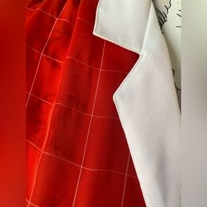 Beautiful semi sheer red blouse with a white collar and white pin striping . Full button down with two sets of buttons. Excellent used condition and a size 14