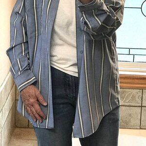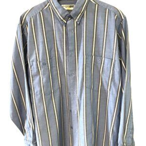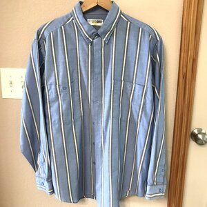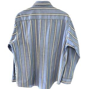 80s button-down oxford shirt, size L, with blue, gray, and cream stripes. This vintage striped men's shirt is in great condition with 2 pockets on the front, a great shirt to wear on its own or layered over a tank or tee!