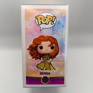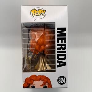 Funko Pop Disney Merida #324 from the Ultimate Princess Celebration series, featuring gold accent detailing and the included collectible pin. A standout release for fans of Brave and Disney Princess collectors looking for elevated designs.