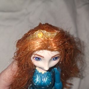 Merida Disney doll with blue dress and golden crown. There's a rip at the top on the back of her skirt as shown. #DisneyPrincess #Merida
