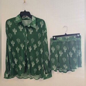 Merigold Kiss Green Cactus Ribbed button-down shirt and shorts Set Size Medium