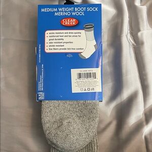 Get ready for winter with these fine merino wool socks. Gray medium weight boot sock by Clear Creek. Made with merino wool for comfort and performance. Wicks moisture and dries quickly. Odor resistant, durable, and comfortable. Perfect for outdoors this winter or to keep your feet warm around the house.