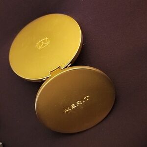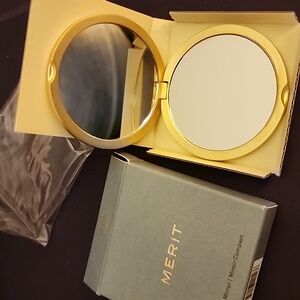 Elegant gold compact mirror by Merit. Perfect for on-the-go touch-ups.