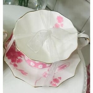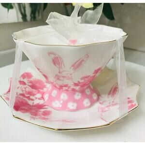 Meritage Easter Spring PINK Bunny Floral Tea Cup & Saucer Plate Set