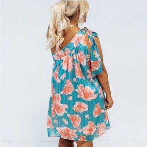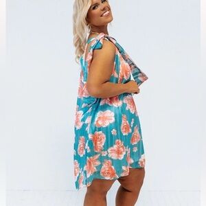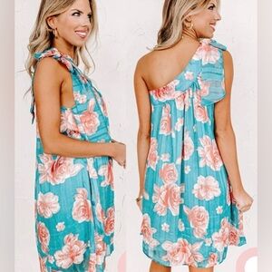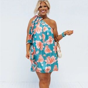 Meritt “Be Mine Forever” Floral Shift Dress in Turquoise. One shoulder tie fastener. Subtle Metallic pin striping throughout. Size 2X. Excellent preowned condition!