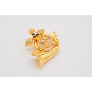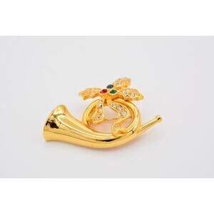 Merksamer Vintage Horn Pin Brooch Rhinestone Crystal Gold Tone Signed 90s BinAT