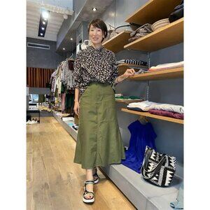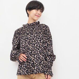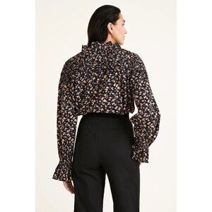 The Majorelle is Merlette's bestselling blouse style. It has a hand smocked yoke and elasticated ruffled collar and cuffs that create a vintage, historical feel. A voluminous offering that can be worn either loose, or tucked into form fitting pants. High neckline. Long full sleeves. Crafted in smooth 100% Pima cotton lawn that has a slight sheen. Liberty style pink on black petite floral print. Unlined. 100% cotton, hand wash. Excellent condition! No flaws or wear.