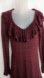 This elegant burgundy knit dress features a stylish ruffled neckline and cuffs.Has metallic red all within the dress. Perfect for any occasion, it combines comfort with a touch of sophistication.