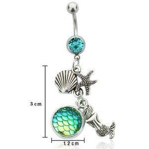 This belly button/navel ring has crystal with mermaid, seashell, and green scale charms. Cute!