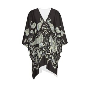 The allure of the mermaid is undeniable. This beautifully cut kimono comes in one size to fit a S-L frame. Flowing arms and soft material are just stunning. Inspired by the enchanting allure of the sea, this kimono features a mesmerizing pattern reminiscent of shimmering scales, evoking the mythical beauty of mermaids.