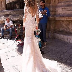 Purchased for photo shoot, never worn. Photographer cancelled due to pandemic. Has been protected in a garment/dress bag for the last year. No defects, all buttons, mesh, and lace beautifully intact. Tags are present(tucked inside of the gown to prevent tearing).