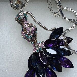 This blue glass and multi-color Austrian crystal necklace is inspired by the mermaid. The blue glass, coveted for its shine and affordability, is accented with Austrian crystals. Crafted from durable metal with a premium finish, each crystal is securely set for durability. The necklace measures 28 inches long and has a lobster claw clasp and extended chain.