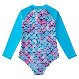 A delightful long-sleeve swimsuit designed for young swimmers. This one-piece features a vibrant mermaid scale pattern in shades of blue, pink, and purple, creating a fun and eye-catching look. The suit includes long sleeves for added sun protection and an easy-slide front zipper for convenient wear. Perfect for a day at the beach, a pool party, or swimming lessons, this swimsuit combines style and practicality for your little one's aquatic adventures.